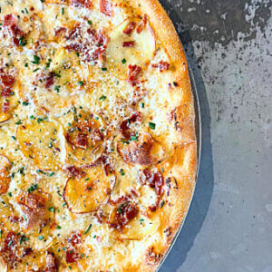 The Baked Potato Pie (Limited Time Only) Crafted with a tangy sour cream base, topped with grated pepper jack and mozzarella cheeses, thinly sliced potatoes, minced garlic, crumbled bacon, fresh rosemary and finished with parmesan and chives - yes please! Created exclusively for Sgt. Pepperoni's by Stan Frazier.